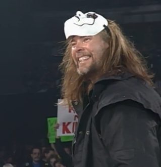 - Jeff Jarrett wearing his Redneck Chippendale outfit walks out to a wave of indifference